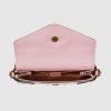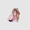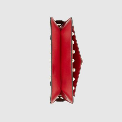 A mini bag with pearl studs and metal bee detail. The bee’s striped body is highlighted with blue enamel and red crystal stones and the wings are embellished with pearl effect studs. The bee-a symbol first seen in Gucci ready-to-wear in the 1970s-was taken from the archives and reintroduced in the Fall Winter 2015 collection.