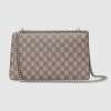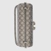The Dionysus shoulder bag with the now defining textured tiger head closure-a unique detail referencing the Greek god Dionysus, who in myth is said to have crossed the river Tigris on a tiger sent to him by Zeus. The embroidered appliqué across the flap reads “Willowhill”-inspired by the botanical garden in Scotland of the same name. Embroidered moths and butterflies further enrich the design, emblems that are seen throughout the Fall Winter 2017 collection. The sliding chain strap can be worn multiple ways, changing between a shoulder and a top handle bag.