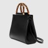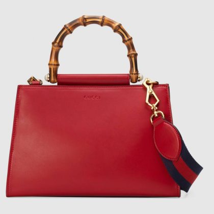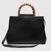 A medium structured leather top handle bag with bamboo handle featuring cream pearl details, referencing Greek and Latin myths surrounding the pearl and water lily-an aquatic plant part of the Nymphaea genus. Made in incredibly soft leather with a natural shine and supple appearance.