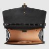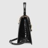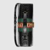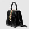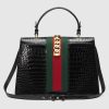 The Sylvie bag in a top handle shape with the nylon Web embedded under the crocodile and decorated with a gold chain and buckle. The metal buckle closure was taken from the House’s archives, and is mixed playfully with the Web stripe. Made in soft crocodile with a distinct shine.